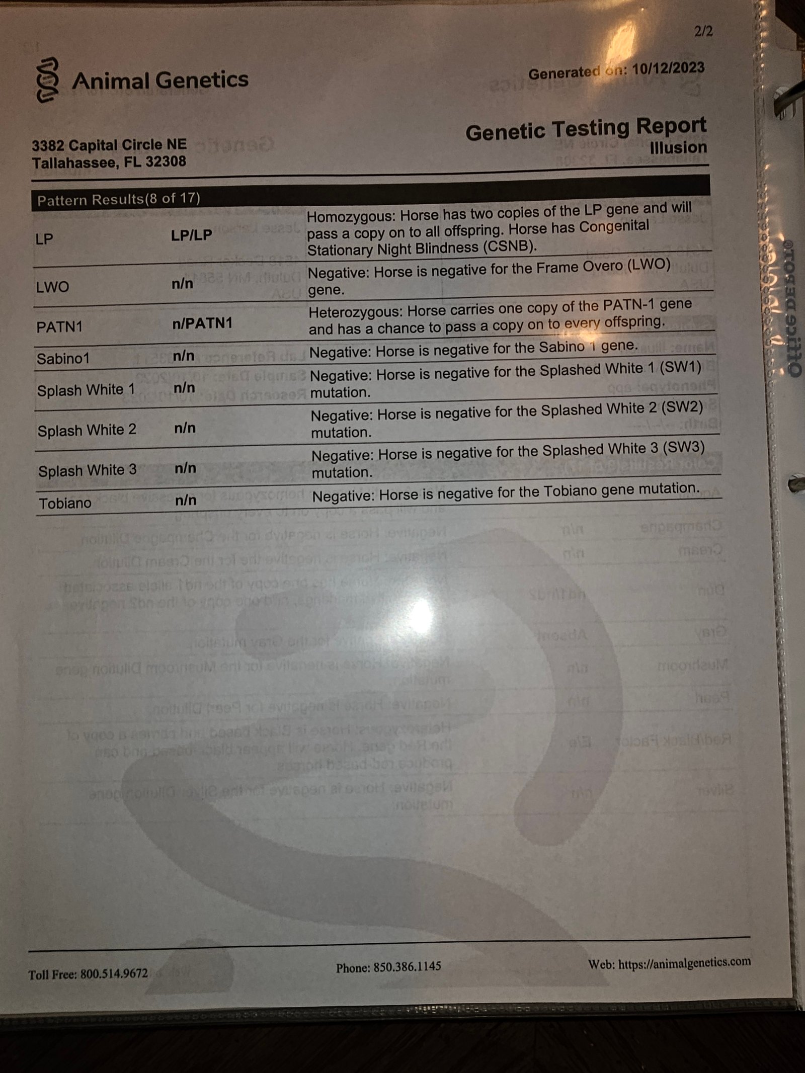 This mare has made lots of leopard appaloosa babies. The reason that is that she has two copies of the leopard complex. LP/LP and one copy of the Pattern gene. The reason this is so special, is because it take one LP and one Pattern to make a leopard. Her genetics give her a 50% chance of a leopard when bred to a solid stallion. A leopard bred to a solid only gives you a 25% chance of leopard baby.