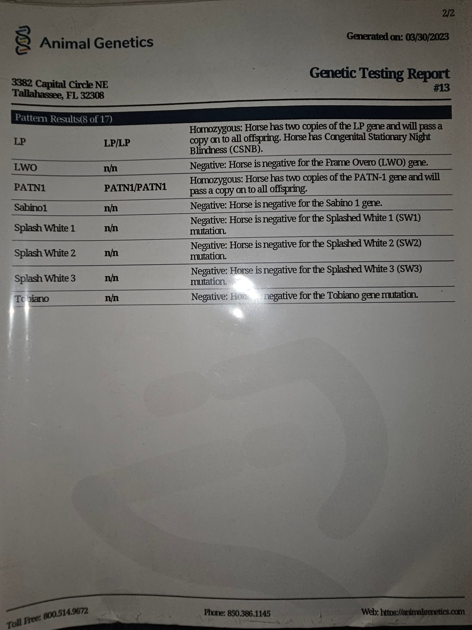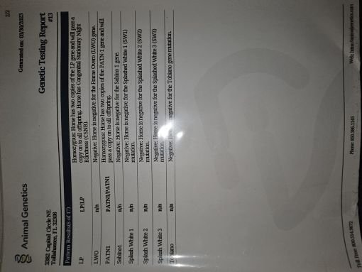 She has amazing genetics. Being that she is Homozygous for Leopard complex and the pattern1 gene, she will produce a leopard appaloosa 100% of the time genetically when bred to a solid colored stallion. If bred to homozygous paint stallion you will get a pintaloosa 100% of the time.
