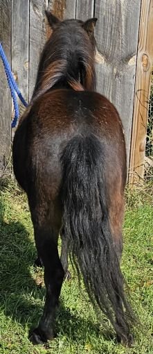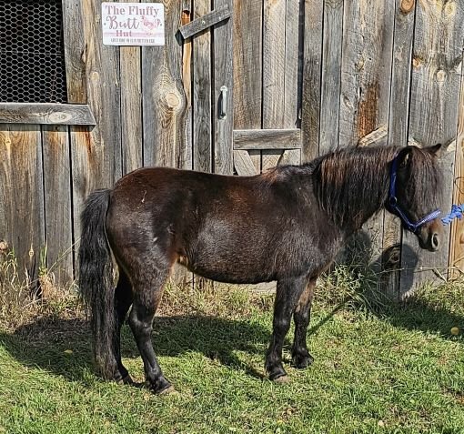 A fine boned mini mare. She hasn't been here terribly long. Yet she is growing on us and becoming more friendly every day we work with her.